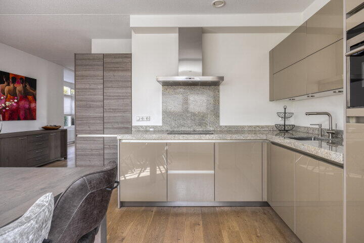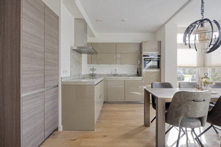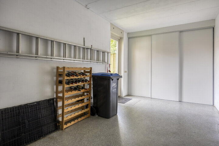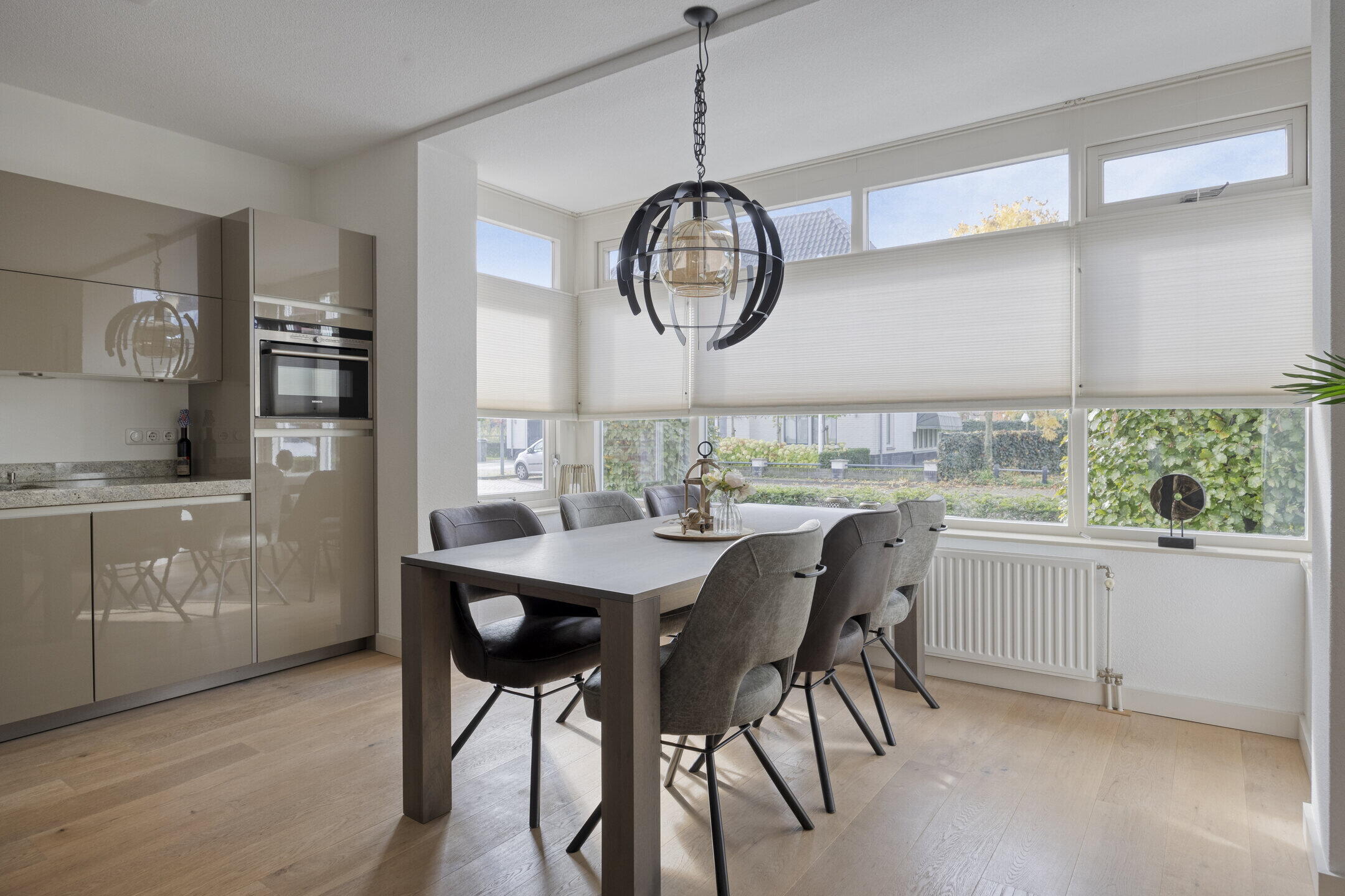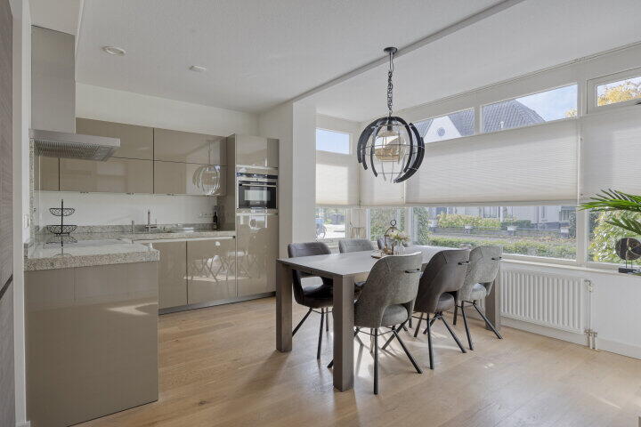 Via de oprit kom je bij de voordeur, waardoor je binnenkomt in de hal met meterkast en toilet en de trap naar boven. Rechtdoor kom je vervolgens in de woonkamer met aangrenzend de open keuken met ruime erker. Het zitgedeelte van de woonkamer ligt aan de tuinzijde. Dankzij openslaande tuindeuren en een tweede erker baadt de zithoek in het licht en heb je een mooi uitzicht. Aan de voorzijde vind je de open keuken met genoeg ruimte voor de gezellige eethoek. De keuken is modern uitgevoerd met een natuurstenen werkblad. De inrichting is compleet, je hebt een inductiekookplaat, afzuigschouw, vaatwasser, combimagnetron-oven, koelkast en vriezer. Opberg- en werkruimte is er meer dan voldoende.