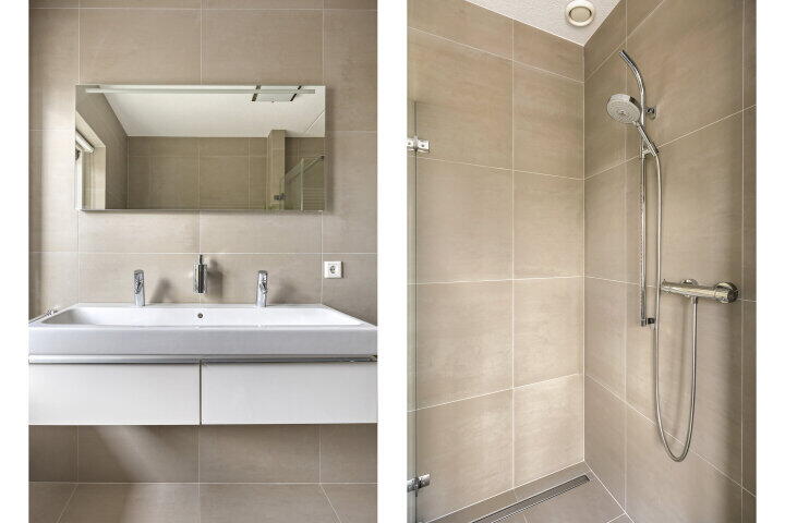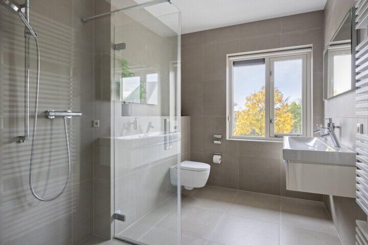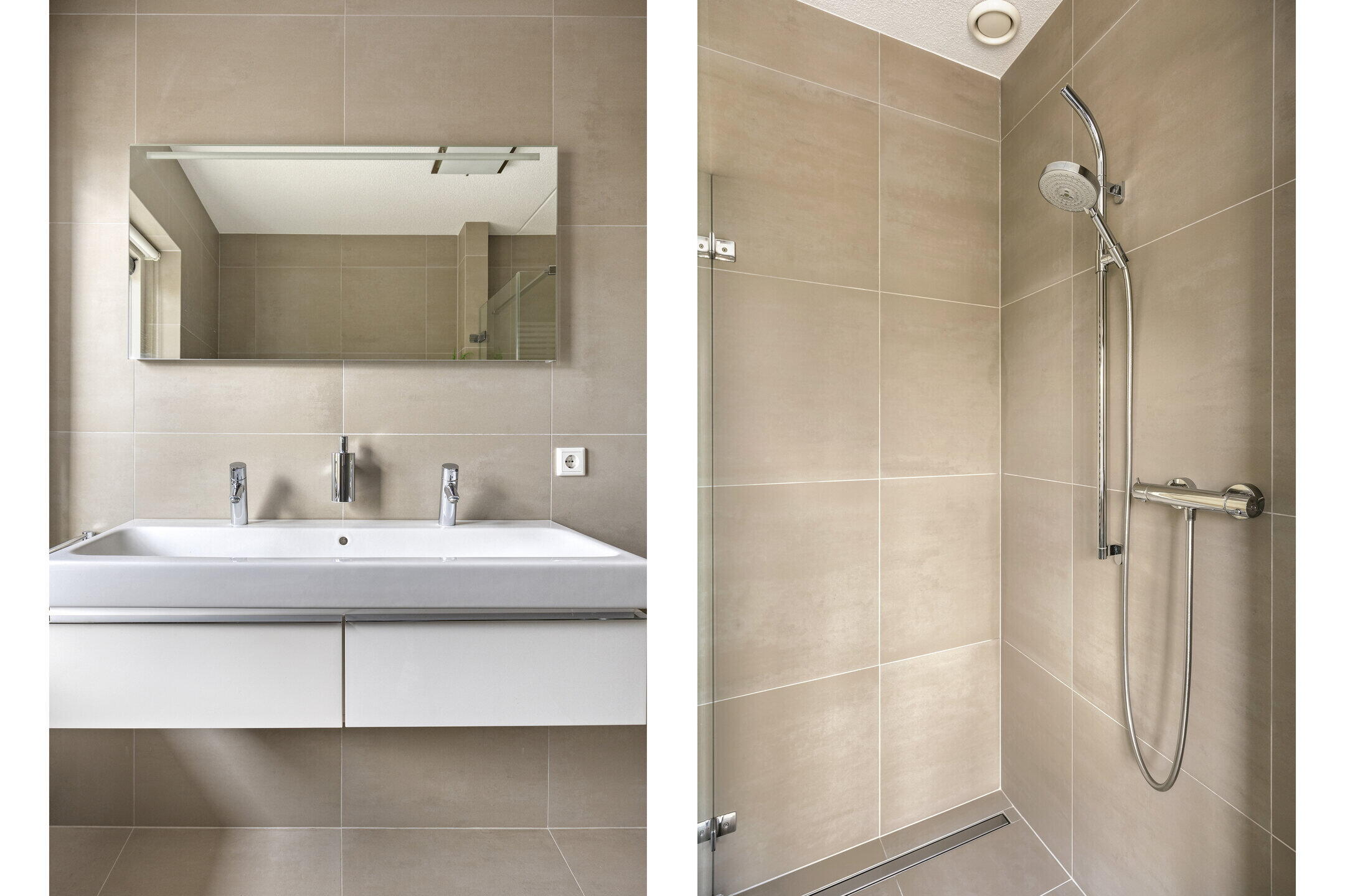 De badkamer is betegeld met grijze tegels, de inrichting is luxe: er is een 2 persoons vaste wastafel in badmeubel, een inloopdouche en een handdoekradiator. Dankzij het grote raam is de badkamer bovendien erg licht en kun je er goed ventileren.