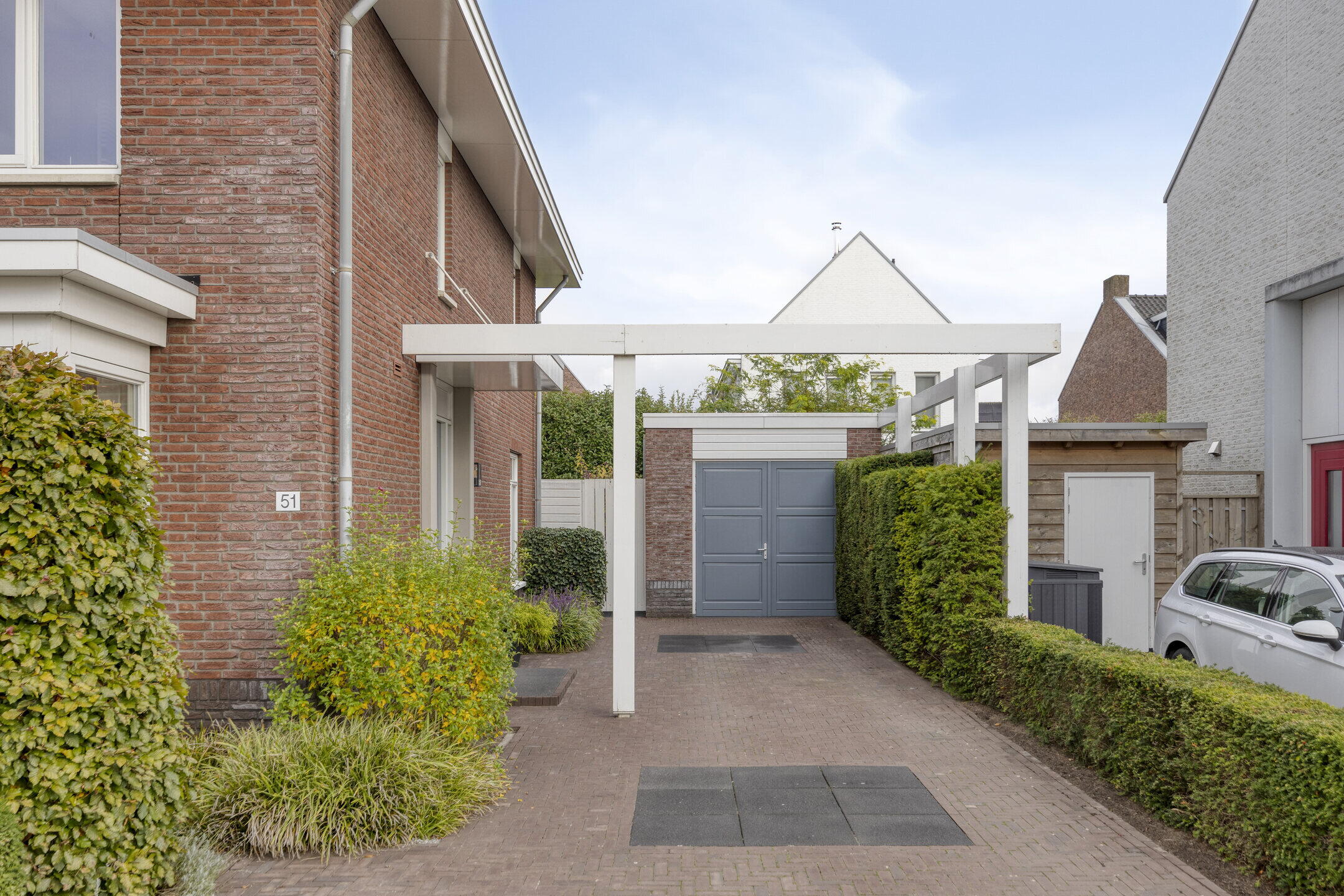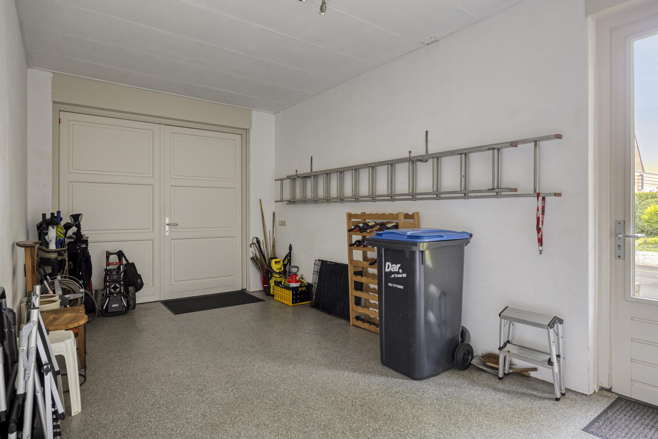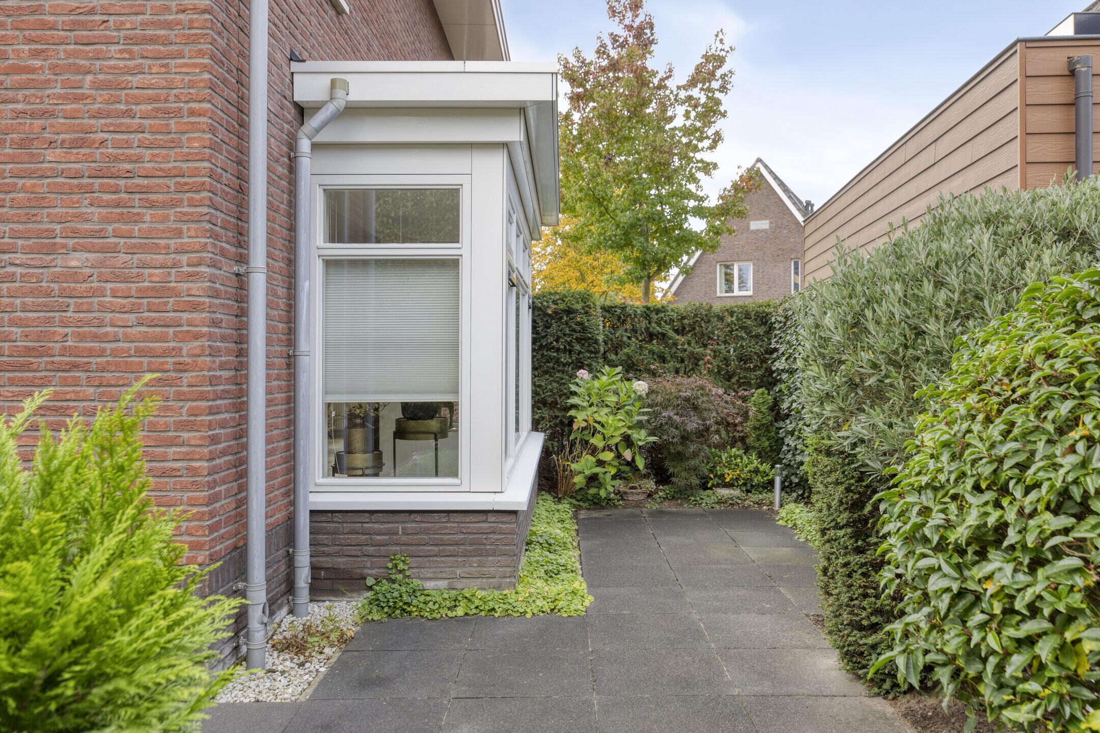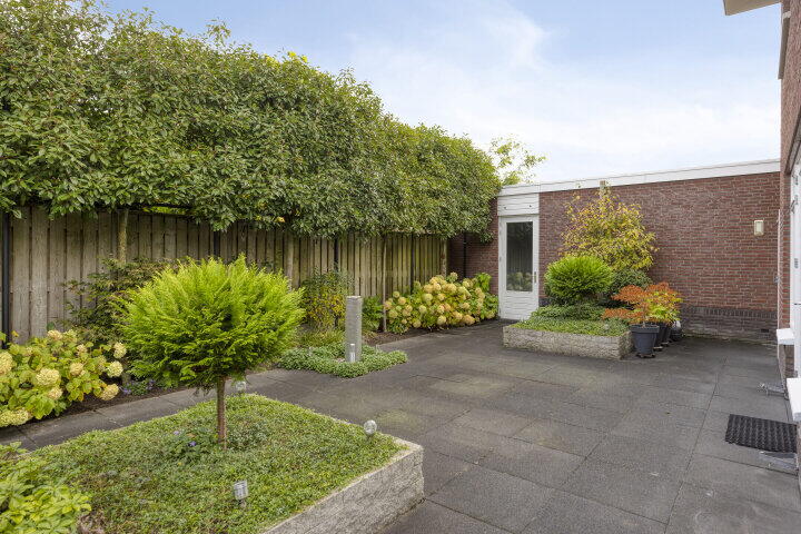 De brede en mooi aangelegde tuin is onderhoudsarm, met een royaal terras, bomen en beplanting. Er is een poort naar de tuin via de oprit aan de zijkant van het huis.