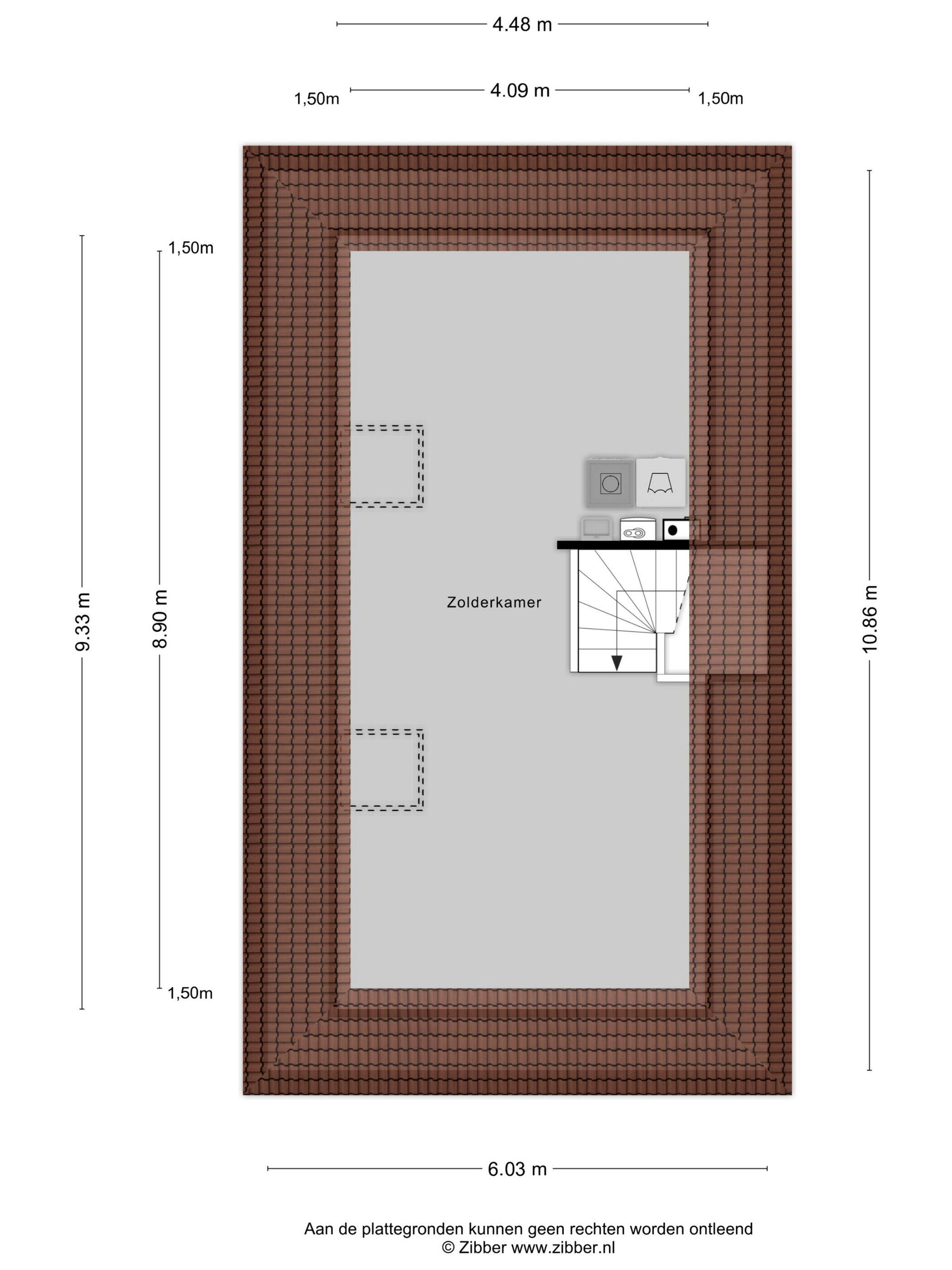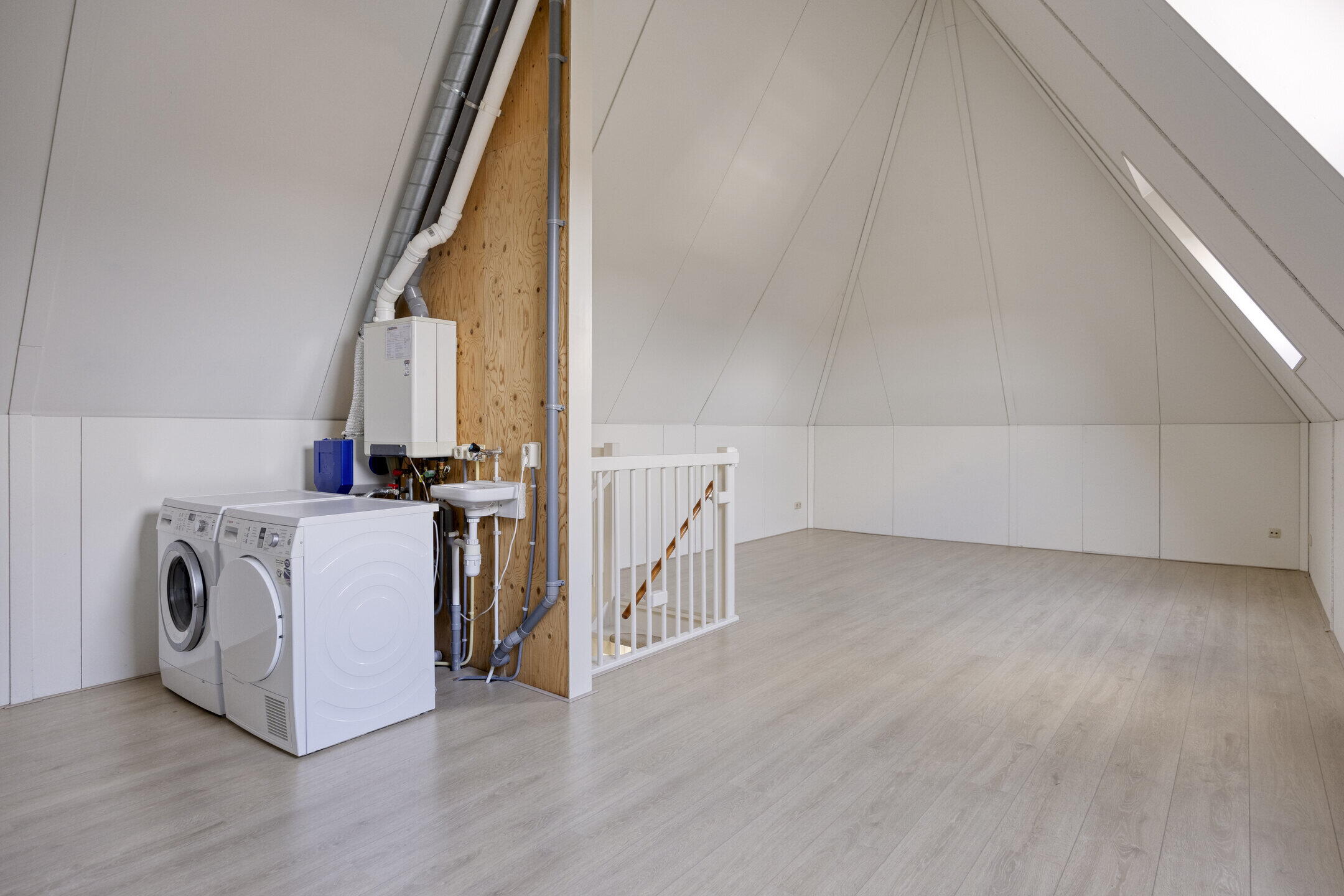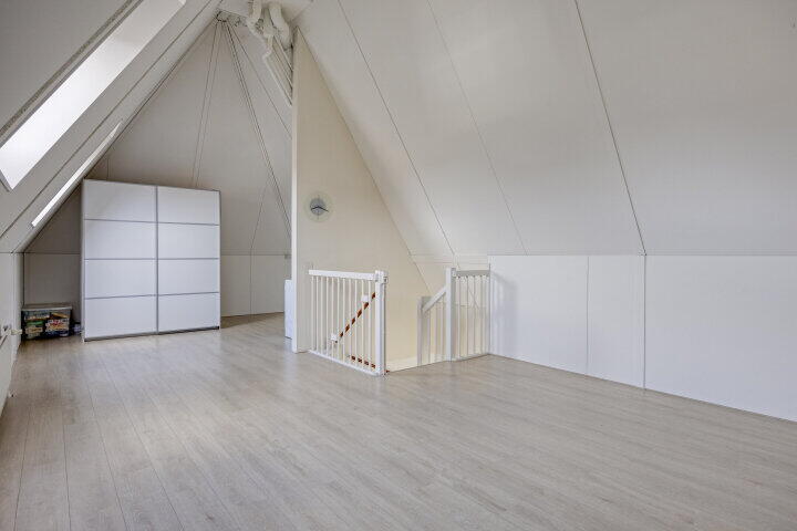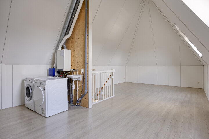 Via een tweede vaste trap kom je op de zolderverdieping. De hoogte van het huis maakt dat deze verdieping ingericht kon worden als volwaardige slaapverdieping met de mogelijkheid van 2 slaapkamers. Twee grote Velux dakramen zorgen voor daglicht. Op deze verdieping vind je tot slot de cv-ketel en de aansluiting voor de wasmachine en droger.