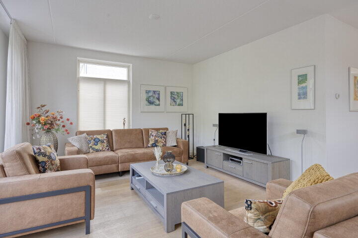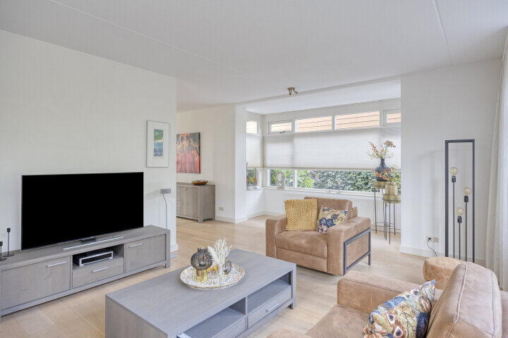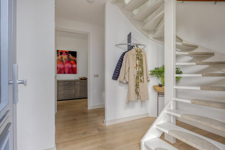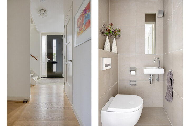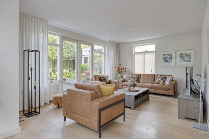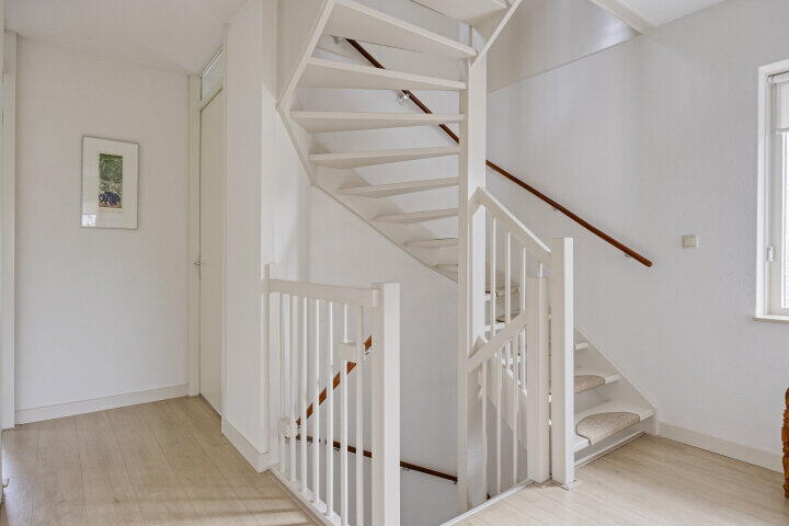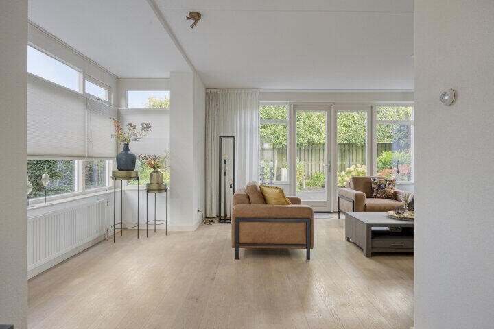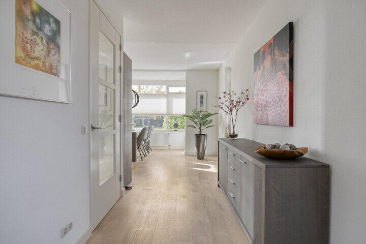 Op de gehele benedenverdieping ligt een fraaie houten vloer en de wanden en plafonds zijn licht afgewerkt.